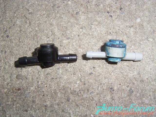 Porównanie starego zaworu (szary kolor) z nowym (czarny). Widać tu różnicę w średnicy króćców wylotowych. Zamiennik ma oba króćce jednakowej średnicy, podczas gdy oryginał posiada króciec wylotowy o mniejszej średnicy niż wlotowy. Nie ma to jednak żadnego znaczenia poza takim, że do montażu zaworu trzeba będzie użyć większej siły.