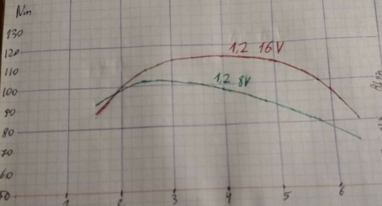 Trochę ciężko się w tym rozczytać. Widać, że 8V ma bardziej płaski przebieg momentu, 16-tka ma faktycznie sporo momentu w okolicach 2000-3000 obr/min, a potem spory spadek, żeby w okolicach czterech dostać dobrego kopa.