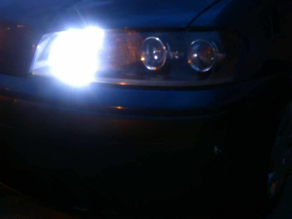 Dzisiaj zakupiłem sobie postojówki LED W5W. Zamierzałem je zamontować jako oświetlenie tablicy rejestracyjnej ale z ciekawości zamocowałem je w przednich reflektorach. LEDy wyglądały o wiele lepiej niż philips blue vision, które paradoksalnie nie mają nic wspólnego z błękitnym odcieniem światła. Niestety na desce wyświetliła się kontrolka informująca o przepalonej żarówce, dlatego zamontowałem stare W5W philips'a w miejscu świateł postojowych, a żarówka LED powędrowała w miejsce oświetlenia tablicy.