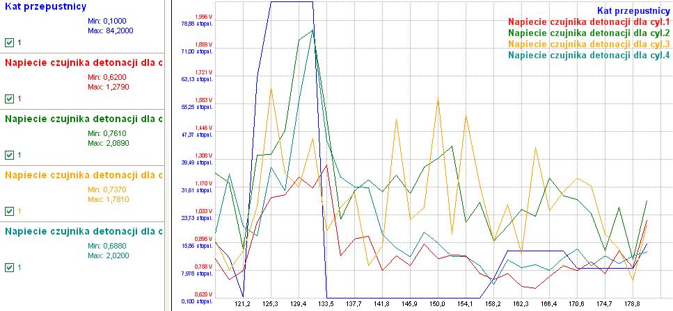 Witam dlaczego podczas hamowania silnikiem czujnik spalania stukowego pokazuje wartości prawie identyczne jak podczas przyspieszania z gazem w podłodze??? hamując silnikiem wtryski nie podają paliwa więc nie ma zapłonu i nie powinno być tym samym żadnych detonacji w cylindrach... wykres poniżej przedstawia pełne przyspieszanie (obrazuje to max otwarcia przepustnicy) po czym puszczam gaz całkowicie, auto zwalnia a czujnik detonacji pokazuje dalej prawie to samo. jak dla mnie wartości detonacji dla wszystkich cylindrów powinny paść na glebę tak samo jak przepustnica ale tak się nie dzieje? dlaczego?