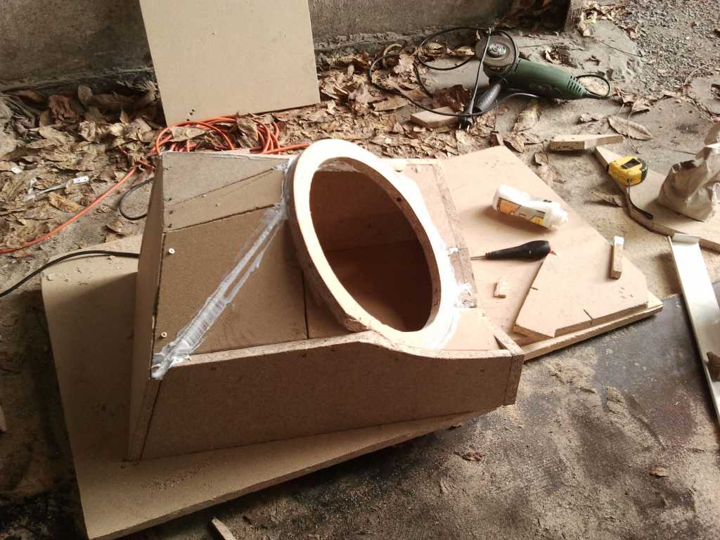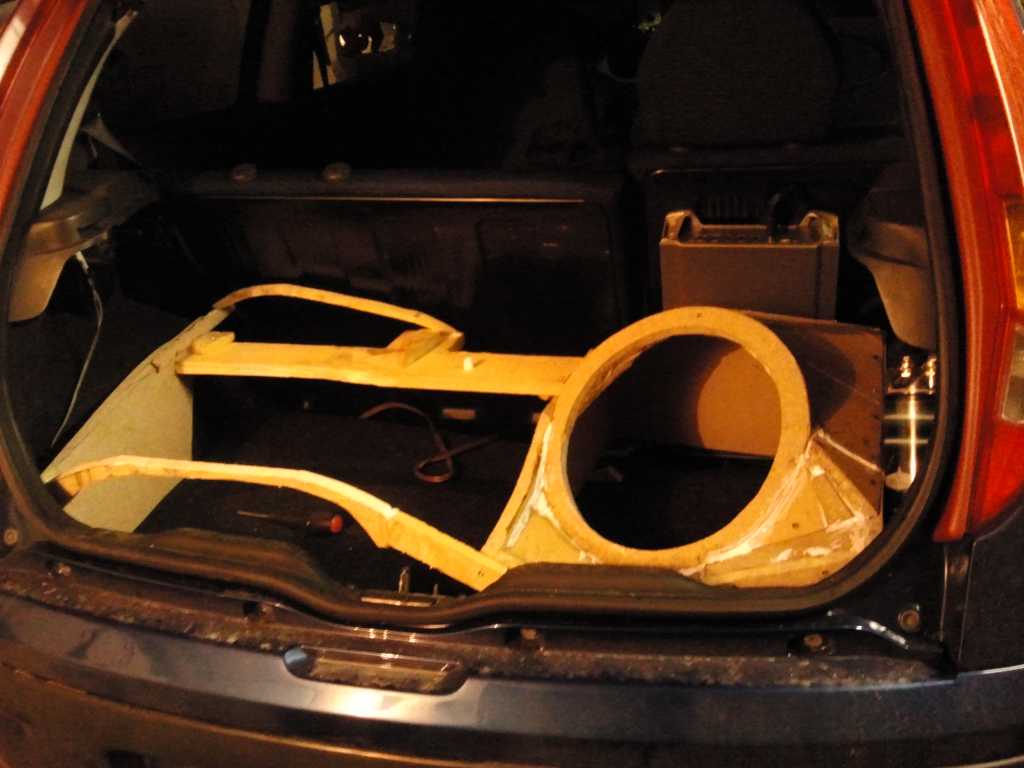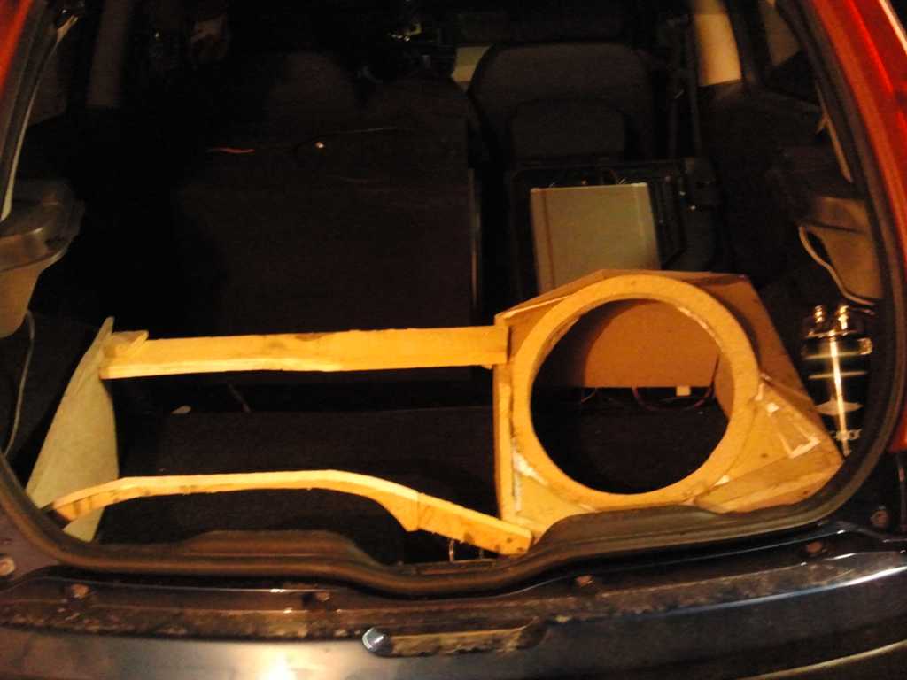 Dziś w skrócie zaprezentuje jak wykonałem zabudowe CA bagażnika w moim kropku  Dodam tylko, że w bagażniku znajduje się jeszcze butla LPG i koło zapasowe pełnowymiarowe  Potrzebowałem do tego: - żywica, - kit żywiczny, - szpachlówka, - płyty (najlepiej MDF), - stare prześcieradło  lub specjalna mata, - wkręty, - taker, - klej do drzewa, - sylikon, - gąbka wygłuszająca, - materiał obiciowy, - papier ścierny, - narzędzia typu pilarka, wyrzynarka, wiertarka, szlifierka kontowa. - aha metr też by się przydał  Naturalnie przyda się też sprzęt który tam zagra  Oraz z 5dni czasu bo robiłem to popołudniami po pracy  Zdjęcia średniej jakości bo wszystko robione tel... Wpierw tworzymy skrzynie pod głośnik czyli przymiarki w bagażniku: - wyciąłem krąg montażowy pod głośnik(z racji że mój głośnik ma dużą głębokość montażową i że mam głośniki w półce musiałem kombinować układ tego kręgu by po zamknięci bagażnika nic nie haczyło): Załącznik: