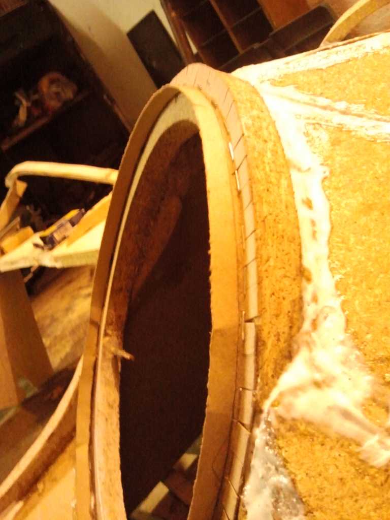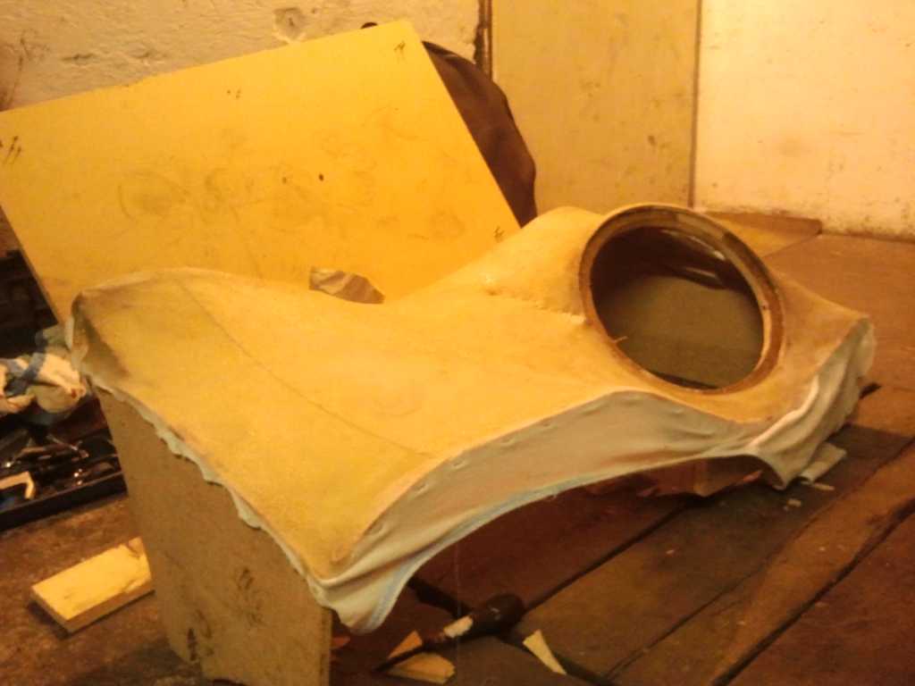 Jak już ładnie uformujemy materiał to mieszamy żywice z utwardzaczem i nasączamy cały materiał zabudowy i czekamy 20min aż ztwardzie, po tym odcinamy nadmiar materiału, zostawiamy tylko z przodu bo będzie nam jeszcze potrzebne  Załącznik: