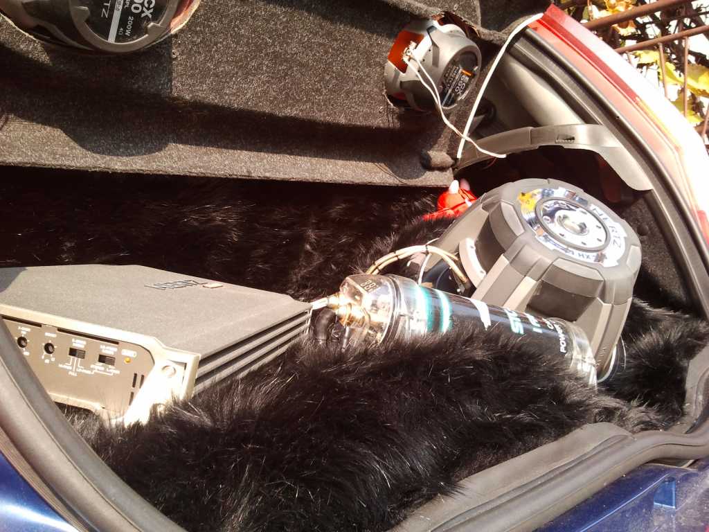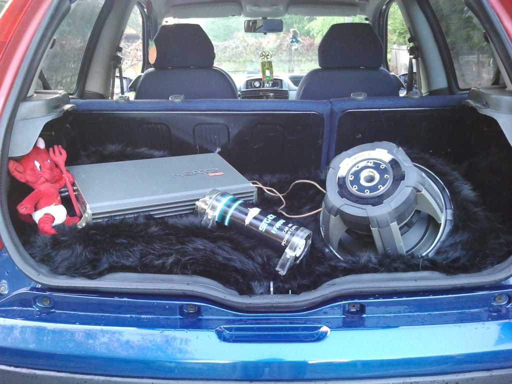 Materiał docinamy, jedynie po bokach zostawiamy po +-25cm, będą nimi obłożone nadkola tak że wszystko się ładnie zleje w bagażniku  Następnie kładziemy oparcie, wkładamy zabudowe do bagażnika, zamykamy oparcie które dociska zabudowe dzięki czemu siedzi ona sztywno, wykładamy nadkola materiałem ewentualnie docinamy nadmiar, zakładamy uszczelkę oraz cały osprzęt  w moim przypadku głośnik, wzmacniacz, kondensator. Podłączamy kabelki, a żeby było schludnie to wiercimy otwory na kable bezpośrednio w miejscach ich przykręcenia tz +/-/rem wzmaka, do kondensatora. Dzięki temu kable się nie walają a są pod spodem zabudowy: Załącznik: