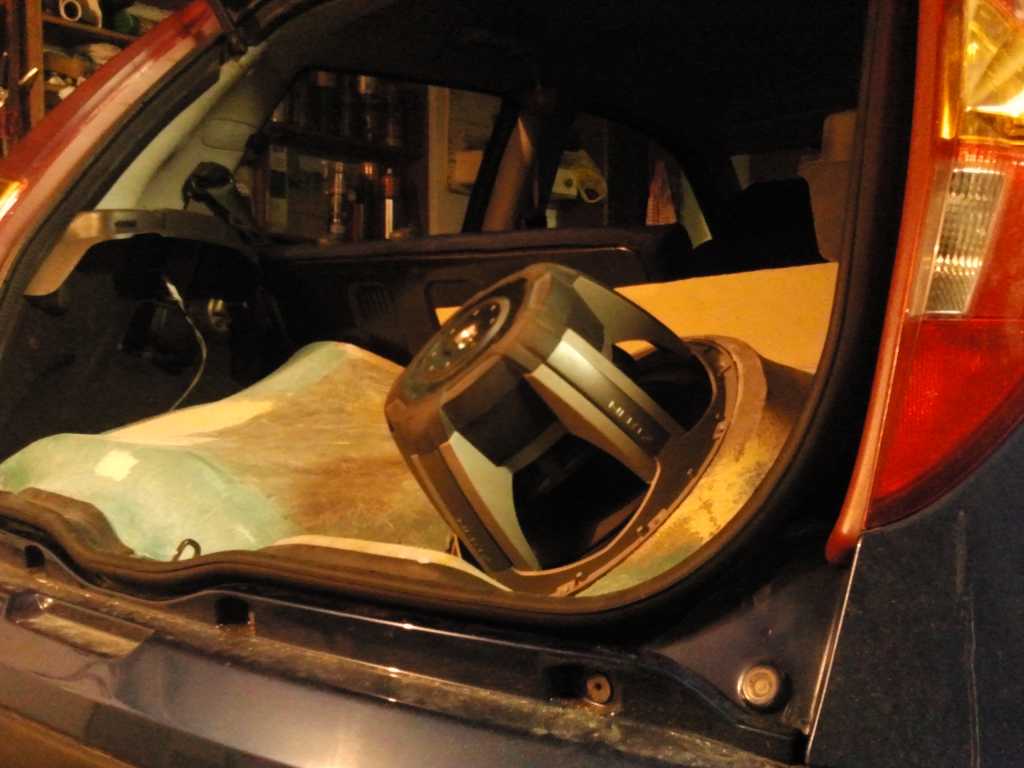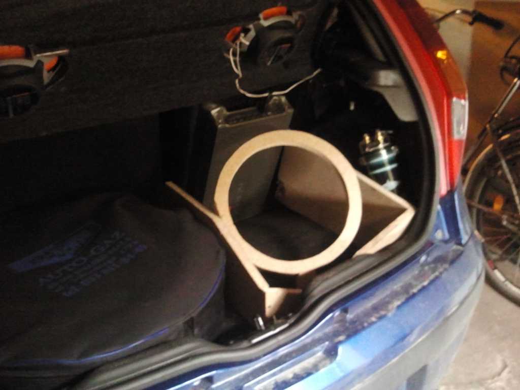 Dziś w skrócie zaprezentuje jak wykonałem zabudowe CA bagażnika w moim kropku  Dodam tylko, że w bagażniku znajduje się jeszcze butla LPG i koło zapasowe pełnowymiarowe  Potrzebowałem do tego: - żywica, - kit żywiczny, - szpachlówka, - płyty (najlepiej MDF), - stare prześcieradło  lub specjalna mata, - wkręty, - taker, - klej do drzewa, - sylikon, - gąbka wygłuszająca, - materiał obiciowy, - papier ścierny, - narzędzia typu pilarka, wyrzynarka, wiertarka, szlifierka kontowa. - aha metr też by się przydał  Naturalnie przyda się też sprzęt który tam zagra  Oraz z 5dni czasu bo robiłem to popołudniami po pracy  Zdjęcia średniej jakości bo wszystko robione tel... Wpierw tworzymy skrzynie pod głośnik czyli przymiarki w bagażniku: - wyciąłem krąg montażowy pod głośnik(z racji że mój głośnik ma dużą głębokość montażową i że mam głośniki w półce musiałem kombinować układ tego kręgu by po zamknięci bagażnika nic nie haczyło): Załącznik: