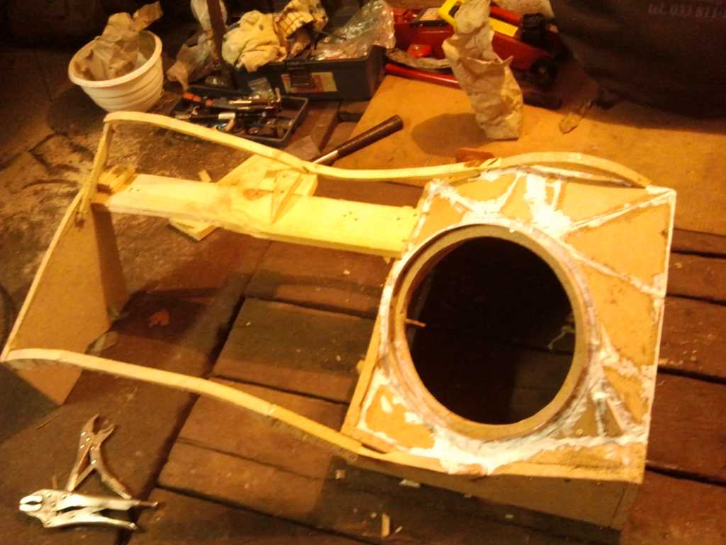 Po odcięciu reszty materiału wyjmujemy zabudowe z bagażnika i od spodu smarujemy cieka warstwę kitu żywicznego oraz od góry modelujemy zabudowe by miała zaokrąglone kształty. I szlifujemy, szlifujemy, szlifujemy  bardzo pomaga szlifierka ale po pierwsze maseczka obowiązkowo a po drugie uważać żeby dziur nie zrobić bo zabudowa ma grubość ok 2mm  mimo to jest twarda i sztywna: Załącznik: