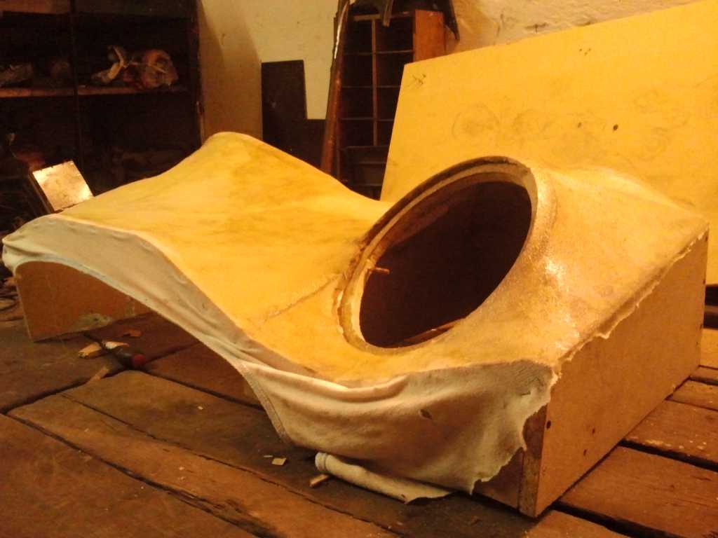 Następnym krokiem jest dokładne uszczelnienie skrzyni oraz sklejenie jej by nigdzie nie uchodziło ciśnienie ze skrzyni... Na całość nakładamy materiał ( ja użyłem starego prześcieradła z frotki bo jest elastyczny i można go idealnie dopasować, naciągnąć) i postrzelać zszywkami : Załącznik:
