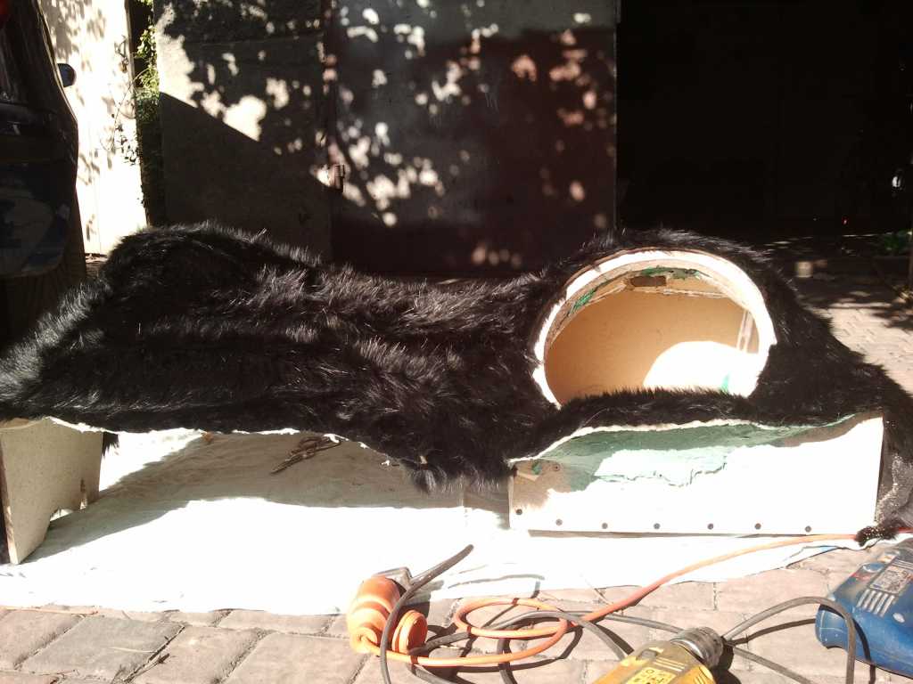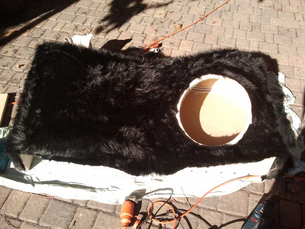 Na wierzchniej warstwie można całość zrobić szpachlówką pod lakierowanie zabudowy, ja tego nie robiłem ponieważ zdecydowałem się na oklejenie materiałem futerkowym. Nałożyłem klej na całość, potem materiał, w miejscach gdzie odstaje strzelamy takerem do czasu wyschnięcia kleju: Załącznik: