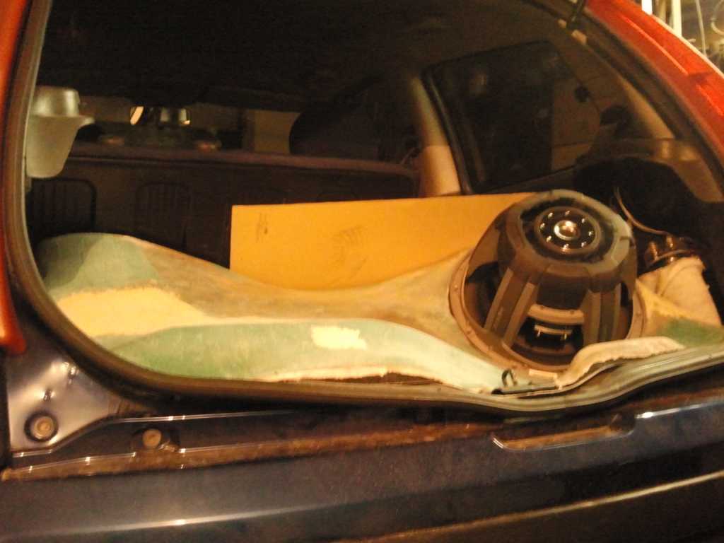 Materiał docinamy, jedynie po bokach zostawiamy po +-25cm, będą nimi obłożone nadkola tak że wszystko się ładnie zleje w bagażniku  Następnie kładziemy oparcie, wkładamy zabudowe do bagażnika, zamykamy oparcie które dociska zabudowe dzięki czemu siedzi ona sztywno, wykładamy nadkola materiałem ewentualnie docinamy nadmiar, zakładamy uszczelkę oraz cały osprzęt  w moim przypadku głośnik, wzmacniacz, kondensator. Podłączamy kabelki, a żeby było schludnie to wiercimy otwory na kable bezpośrednio w miejscach ich przykręcenia tz +/-/rem wzmaka, do kondensatora. Dzięki temu kable się nie walają a są pod spodem zabudowy: Załącznik: