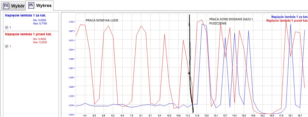Na wolnych w miarę równomiernie, chociaż drżenie na miejscu kierowcy czuję może to już przeczulenie na cokolwiek. Z małych poza ruszaniem (szczególnie na rozgrzanym silniku) tak jak pisałem wcześniej jest problem, to już podczas jazdy jest ok. Jutro po 16-17 mogę wrzucić wykresy sond z krótkiej jazdy, oczywiście po jej odbyciu  Jeszcze rozważam 1 możliwość, chociaż nie wiem czy mam rację. Spód auta był zalany olejem (dostał w michę, wiem od sprzedającego). Możliwe że kata przegrzał, tylko czy taka interpretacja jest prawidłowa ? [ Dodano: 28 Maj 2012 16:34 ]Wykasowałem błąd, ale mam zupełnie inny odczyt sond niż ten z postu 1. Przed wykasowaniem błędu odczyty były zbliżone. Nie wiem dlaczego takie kwiatki wychodzą, zaznaczam, że przed tym odczytem z 1 postu miałem to samo. Po zamianie sond stał się cud, ale znowu wróciło do "normy" ? Czy cosik jest z napięciem ? [ Dodano: 29 Maj 2012 17:24 ]Mam także dane z analizatora spalin na biegu jałowym. CO 0,32 % CO2 14,18 % HC 168 ppm - wiem, że jest za wysokie O2 1% NO 0 PPM LAMBDA 1,030 COcor. 0,33%