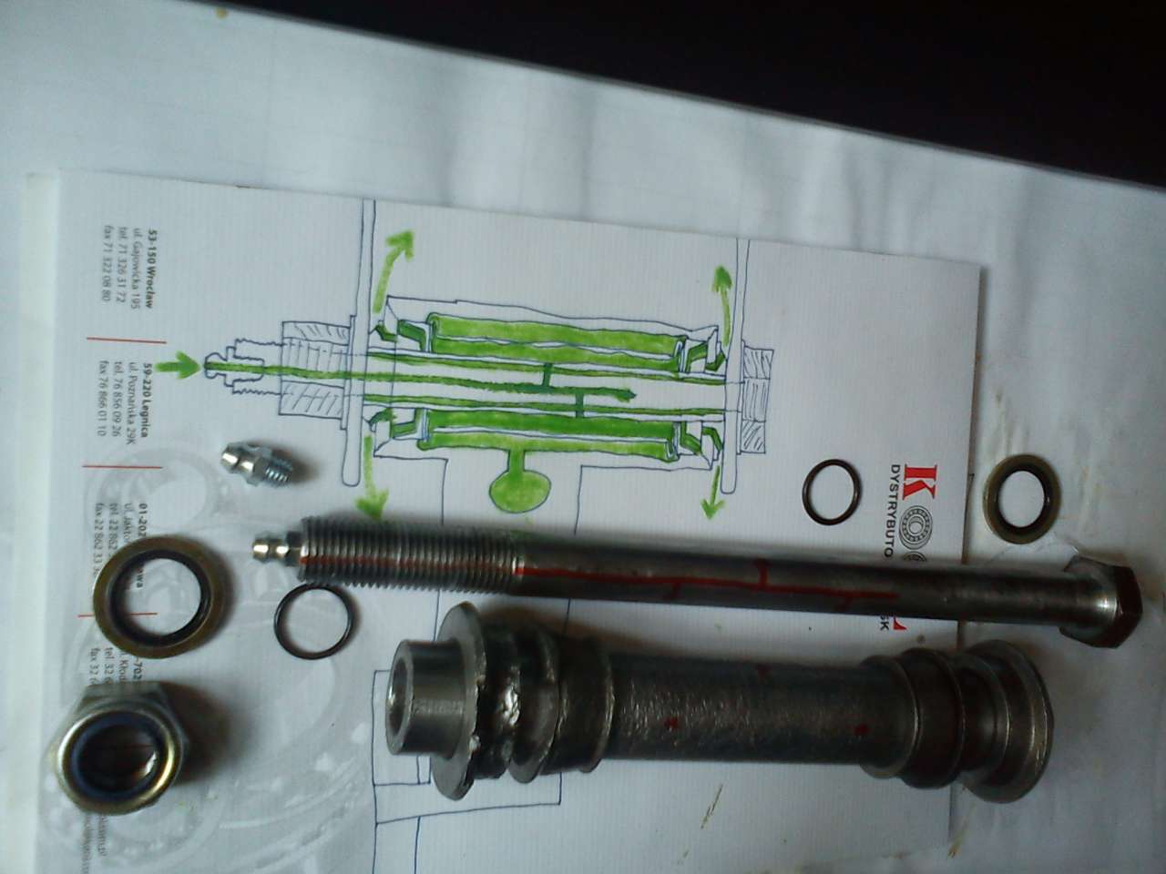 Panowie chyba pytają/wypowiadają się, nie czytając co jest zawarte w całym temacie... Nie ma co roztrząsać kwestii, który zestaw "lepszy", jeśli całe rozwiązanie ułożyskowania (i jego uszczelnienia) jest fabrycznie niedorobione (i tak się w końcu rozsypie po zardzewieniu - to jest nieuniknione). Na pewno NIE warto przepłacać i kupować zestawu za około 90-100 złotych (zamiast np. 40-50), tylko dlatego, że ma tubkę smaru "gratis"! Obecność smaru nie świadczy o jakości zestawu (nie w tym rzecz), a jak już dadzą, to pewnie byle jaki. Powracając do modyfikacji, to są małe postępy (o dalszych będę informować). W ciągu 1-3 miesięcy będę wymieniać zestaw z jednej strony (pojawiły się luzy po tej zimie), na razie ćwiczę na pozostałościach po starym zestawie wymienianym kiedyś z drugiej strony. Kanał na smar już jest wykonany w śrubie (teraz trzeba pomyśleć, gdzie ten nowy smar dalej kierować, by wypchać stary).  Co do typu smaru, to oczywiście będzie to coś lepszego niż przeciętniak "ŁT-43" z hipermarketu, czy "gratisowy" smar (czyli o niewiadomym typie/składzie) z zestawu naprawczego wahacza. Wstępnie jakiś przemysłowy Castrol albo KERNITE (>link<).Ogólnie powinno to być coś do zastosowań typu "niska prędkość/duży nacisk"...