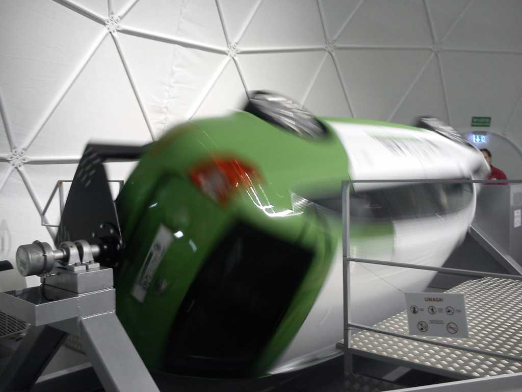 Tak to wyglądało w praktyce: http://youtu.be/tNozSB_Sn7k?t=30s (znalezione na YT) Wewnątrz było kilka plastikowych piłeczek, które uatrakcyjniały symulację. Wniosek po teście: lepiej nie wsiąść do tej Skody z pełnym żołądkiem. Tuż obok "wirówki" stoi fotel na szynach, który symuluje uderzenie w przeszkodę. Przed uczestnikami symulacji stoi pewne zadanie, ale żeby nie psuć zabawy, nie zdradzę jakie  Załącznik: