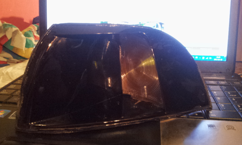 Można jeszcze pomalować obrzeża szkła na czarno, a odbłyśników tych w środku nie radzę malować, bo po prostu nie odbija się światło i kierunek świeci wtedy tylko punktowo, czyli jak dioda w światełku rowerowym. klejenie zwykłym czarnym silikonem wystarcza, mi do dzisiaj się nic nie rozkleiło coś na ten styl pomalować i efekt wtedy z czarną lampą jest spoko, bo czarne obramówki szkiełka kierunkowskazu się zlewają z reflektorem. Czyli odbłyśnik dół i bok - zostawiamy jak fabryka nakazała