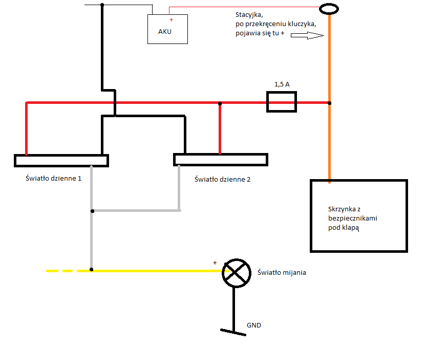Musiałem zlokalizować przewód, którym płynie napięcie gdy przekręci się stacyjkę. Załącznik:
