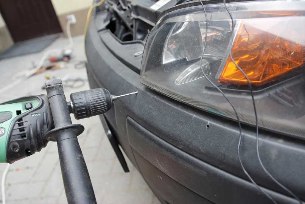 Wiercenie i dziurawienie zderzaka. Bałem się co z tego będzie. Ryzyk fizyk  . W odmierzone odległości i wyznaczone kropki wierciłem dziurki. Wiertarka stała się frezarką. Załącznik: