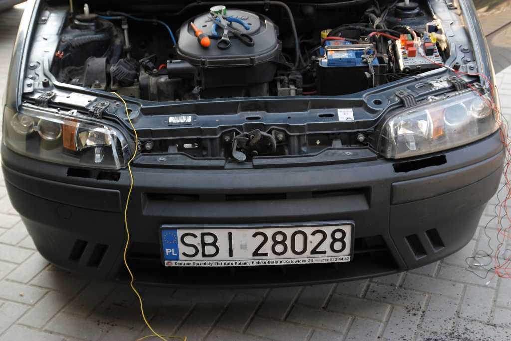Pomysł "zielony" odpadał. Lampy były by za blisko. Pomysł "różowy" odpadał. Lampy za nisko. Pomysł "niebieski" odpadał. Podobno lampy maja ustalone gdzie jest góra, a gdzie dół i tak mają być montowane. Pozostał pomysł "czerwony". Niestety nie obeszło się bez rozwalania zderzaka. Przymiarki: Załącznik: