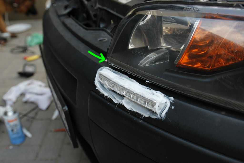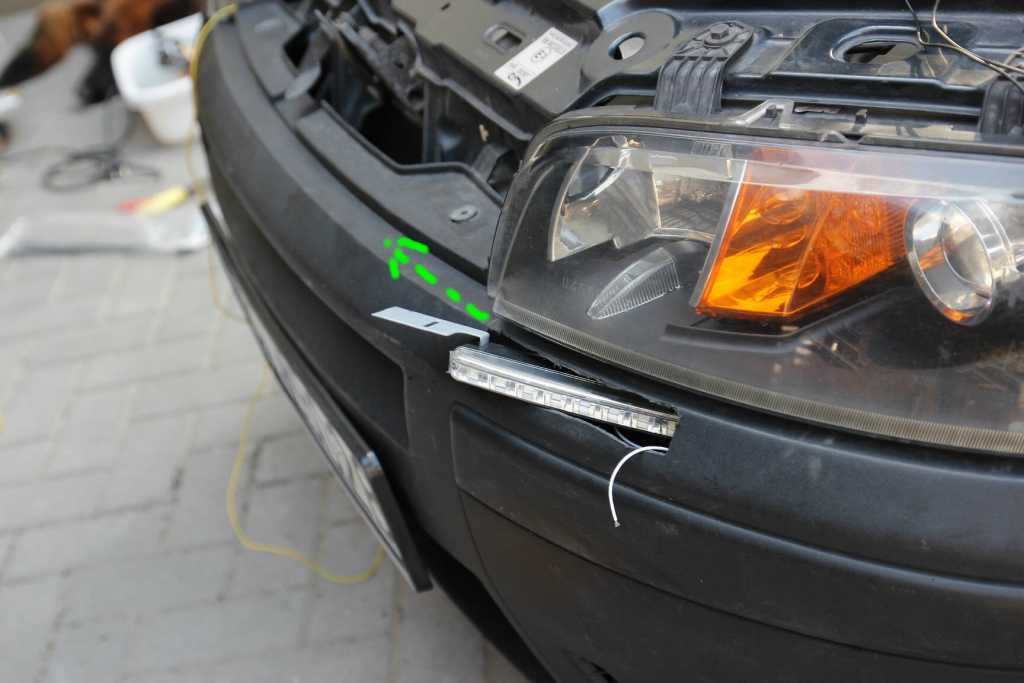 Z rzeczy które miałem przydało się: - silikon do uszczelnienia dziur - czarna farba do malowania silikonu - oczywiście wiertarka - wiertła (5 i 10) - pilniki - lutownica (cyna, kalafonia) - śrubokręty - taśma izolacyjna - i inne Było wiele pomysłów co do montażu. Chciałem się jednak skupić przede wszystkim, by w przyszłości nie było problemów prawnych. Stosowałem się reguł:  Dodatkowo światła powinny się włączać automatycznie po włączeniu zapłonu. I jeszcze zacytuję wikipedię: Cytuj: W przypadku włączenia świateł mijania światła dzienne mają zostać samoczynnie wyłączone. Dodatkowo, w samochodach rejestrowanych po raz pierwszy po 31 grudnia 2009 roku, światła pozycyjne tylne, światła obrysowe przednie, boczne i tylne oraz oświetlenie tablicy rejestracyjnej nie mogą włączać się razem ze światłami dziennymi. W pojazdach rejestrowanych do 31 grudnia 2009 roku dopuszcza się zainstalowanie świateł do jazdy dziennej w taki sposób, że włącza się również oświetlenie pozycyjne oraz tablicy rejestracyjnej. Załącznik: