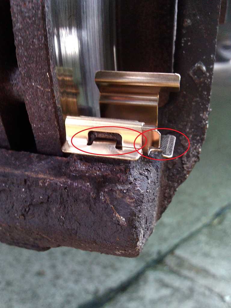 7. Zakładamy nowe blaszki - nie da się ich inaczej założyć, można od razu rozplanować które gdzie mają być przy zdejmowaniu starych. Ważne, żeby blaszki wskoczyły w rowek na froncie zacisku. Załącznik: