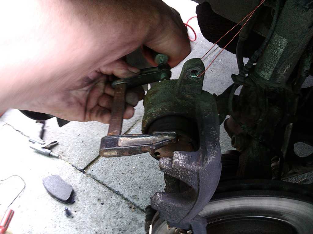 8. Teraz przystępujemy do ściśnięcia tłoczka. Najlepiej użyć do tego ścisku stolarskiego i kawałka drewna. Wtedy siła jest równomierna i nic nie szarpiemy itd. Ja jeszcze wcześniej odkręciłem pokrywkę zbiorniczka od płynu hamulcowego. Kręcimy ścisk aż tłoczek zrówna się z obudową czyli całkiem. Załącznik: