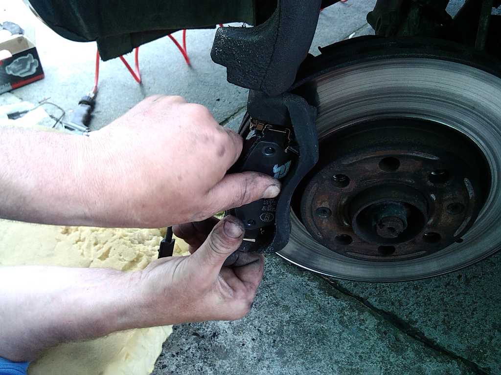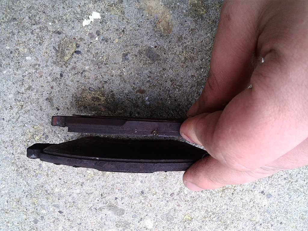 5. Wyciągamy stare klocki z obu stron tarczy. Można podważyć płaskim śrubokrętem. Nie przejmować się tym, że wypadną blaszki. 6. Oto co zobaczymy - trzeba wyjąć blaszki (po 2 z każdej strony tarczy). Miejsca pod blaszkami należy dokładnie oczyścić z syfu - można użyć szczotki drucianej, można śrubokrętem. Na koniec dobrze użyć kompresora i przedmuchać wszystko. Jest to kluczowy moment, ponieważ gdy zostanie dużo syfu, zwłaszcza w zakamarkach to będzie ciężko wepchnąć nowe klocki ponieważ blaszki nie będą idealnie stykać się z podłożem. Załącznik: