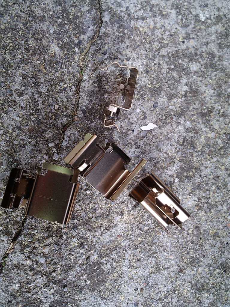 7. Zakładamy nowe blaszki - nie da się ich inaczej założyć, można od razu rozplanować które gdzie mają być przy zdejmowaniu starych. Ważne, żeby blaszki wskoczyły w rowek na froncie zacisku. Załącznik: