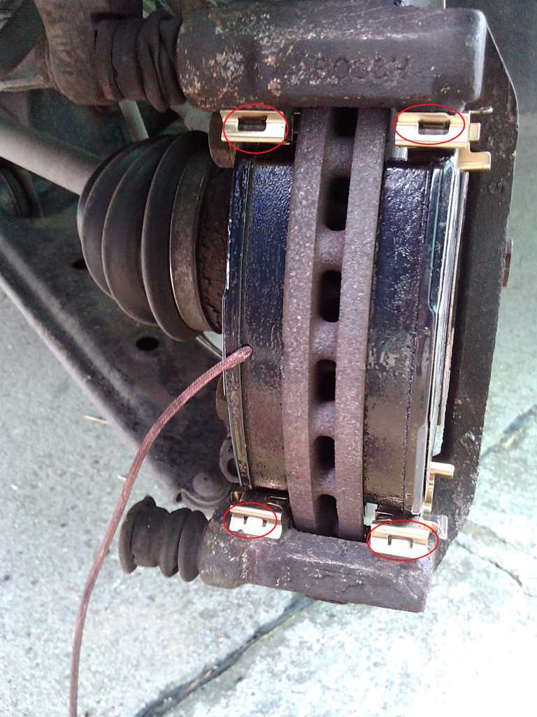 5. Wyciągamy stare klocki z obu stron tarczy. Można podważyć płaskim śrubokrętem. Nie przejmować się tym, że wypadną blaszki. 6. Oto co zobaczymy - trzeba wyjąć blaszki (po 2 z każdej strony tarczy). Miejsca pod blaszkami należy dokładnie oczyścić z syfu - można użyć szczotki drucianej, można śrubokrętem. Na koniec dobrze użyć kompresora i przedmuchać wszystko. Jest to kluczowy moment, ponieważ gdy zostanie dużo syfu, zwłaszcza w zakamarkach to będzie ciężko wepchnąć nowe klocki ponieważ blaszki nie będą idealnie stykać się z podłożem. Załącznik: