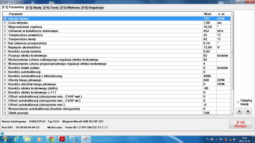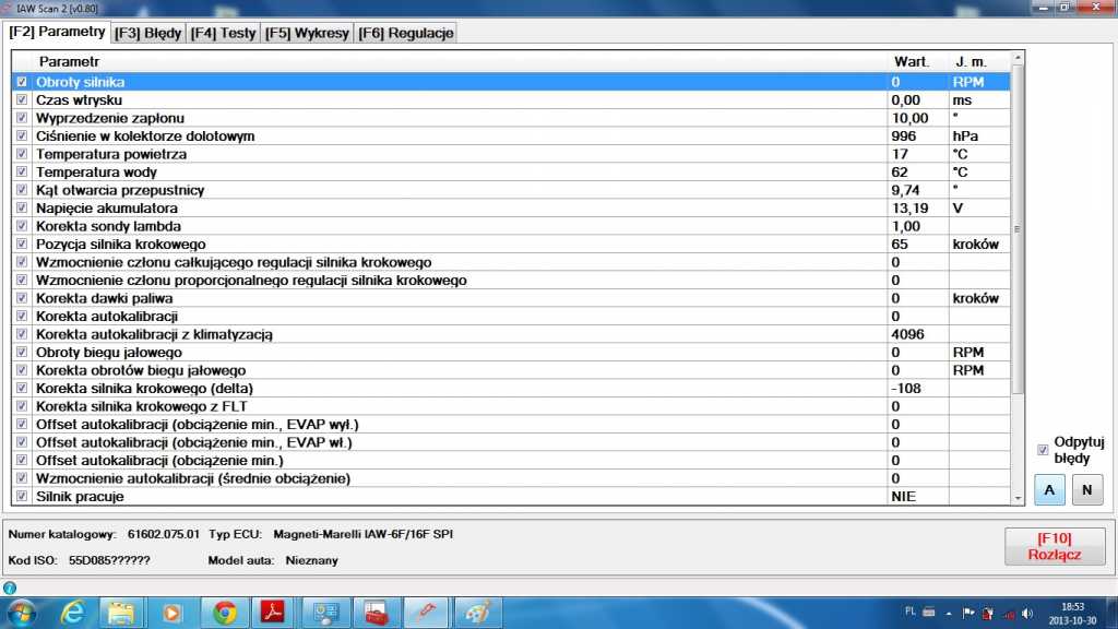 Objawy takie że pod odpaleniu, bez względu na to czy silnik już jest ciepły czy jest odpalony na zimno, poszarpuje silnikiem oraz śmierdzi paliwem ze spalin. W trakcie jazdy także czuć nierówną pracę silnika oraz znaczący brak mocy silnika podczas przyśpieszania.. Gdy silnik się już nagrzeje to pracując na biegu jałowym obroty spadają do około 500 i szarpie silnikiem jakby miał za chwilę zgasnąć. Poniżej zamieszczam screeny z diagnostyki którą dziś wykonałem.