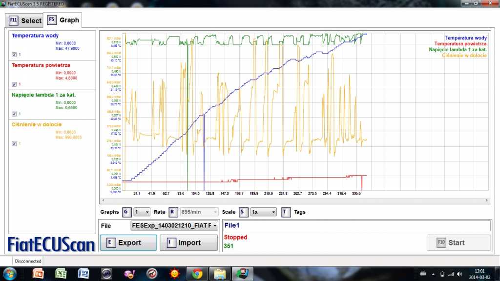 Cytuj: Czy już nie gaśnie na wolnych obrotach? Nie, natomiast mam wrażenie, że coś rozładowuje akumulator i to tylko kwestia czasu zanim znowu będą problemy z odpalaniem - dziś ECU przed odpaleniem pokazywał napięcie akumulatora na 11,6 V. Niestety nie mam dostępu do wiarygodnego miernika - jeden jest stary jak świat (to taki zwykły o jakim mówisz - to on zwykle pokazuje niskie wartości napięcia akumulatora), a drugi to taki, który ma kilka diod i pokazuje na jakim poziomie (jednym z 3) jest naładowany akumulator - a więc nic dokładnego. Cytuj: Co do termostatu, na zimnym silniku (najlepiej po nocnym postoju auta) przejedź 1-2km (bez żadnego grzania na postoju, wsiadasz przekręcasz kluczyk i od razu jedziesz) zatrzymaj się podnieś maskę i pomacaj przewody idące do chłodnicy i chłodnicę (powinny być co najwyżej letnie) jeśli są gorące to znak że termostat nie trzyma i wypadało by wymienić. Tak dzisiaj zrobiłem - przewody i chłodnica były ciepłe (czujnik wskazywał 50*C), ale nie gorące. Cytuj: Spróbuj zalogować dane używając programu dołączonego do interfejsu (taki ogólny program do eobd). Napięcia sond z tego co się orientuję są dostępne też bezpośrednio przez pidy zdefiniowane przez eobd Może narażam się na śmieszność, ale jako że niedawno zacząłem swoją przygodę z motoryzacją, nie za bardzo rozumiem co tu napisałeś ;( Mam fiatecuscan, a nie multiscan jeśli to jakaś różnica, nie za bardzo wiem o jaki dodatkowy program chodzi. Gdybyś mógł łopatologicznie wytłumaczyć jak zmierzyć napięcie sondy poprzez "pidy" zdefiniowane przez eobd byłbym wdzięczny. To skan z krótkiej jazdy z czujnikami temperatur, ciśnieniem w wylocie, sondą lambda za katalizatorem. Temperatura powietrza rośnie powoli, ale to dlatego, że włączony był nawiew z chłodnym powietrzem - podczas wczorajszego skanu rosła prawidłowo więc nie sądzę, by tu był problem. Załącznik: