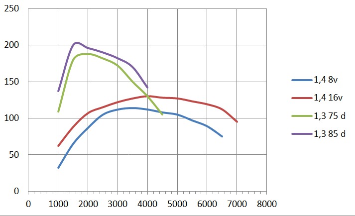 pozwoliłem sobie na przerysowanie wykresów momentów obrotowych silników 1,4 benzyna 8v i 16 v oraz diesli 75 i mocniejszego. osobiście wydaje mi się, że wartości momentu dla benzynówek ciut zaniżone dla niskich obrotów za ich poprawność nie odpowiadam, gdyż dane pobrałem z ciekawej stronki z dużą ilością danych http://www.automobile-catalog.com 1,4 16v to moc 105 kM tu dane przyspieszeń: Załącznik: