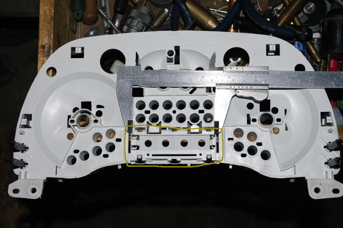 Następnie trzeba wyfrezować w białym plastiku miejsce na nową płytkę wyświetlacza. Płytka wyświetlacza niestety musi zachodzić prawie do połowy otworów podświetlenia informacji o światłach, itp. Załącznik: