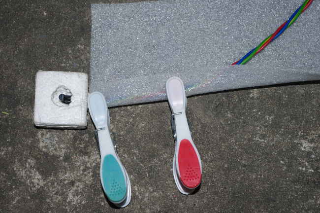 Izolujemy kable używając folii piankowej polietylenowej. W pierwszym kroku owijamy kabel pianką. Przewód kładziemy około 1-2 cm od krawędzi pianki, zaginamy folię i co około 10 cm łapiemy używając klamerek do prania. Załącznik: