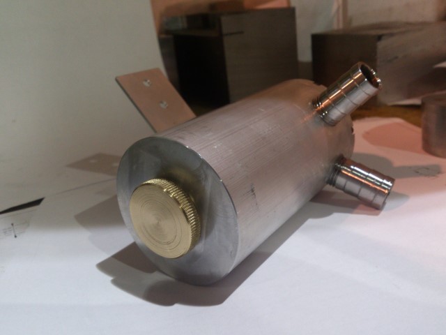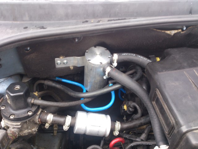 Wylklikałem coś takiego:  i mam zamiar użyć to jako odstojnik do odmy. Zbiornik to filtr fazy lotnej do instalacji LPG (koszt niecałe 30pln). Wkład filtrujący nie będzie zamontowany. Ponieważ zakupy robiłem w sklepie specjalizującym się w rzeczach do LPG, to wąż jest przeznaczony do gazu... hmmm... na 99% jestem przekonany że da radę.