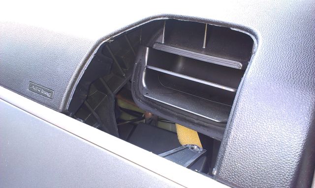 Komentarz do pliku: Po wyjęciu mamy taki oto widok. Nad strzałką jest wkręt torks który mocuje kratkę do deski rozdzielczej. Nie widać go z tej pozycji trzeba się schylić i "wsadzić" tam głowę :)