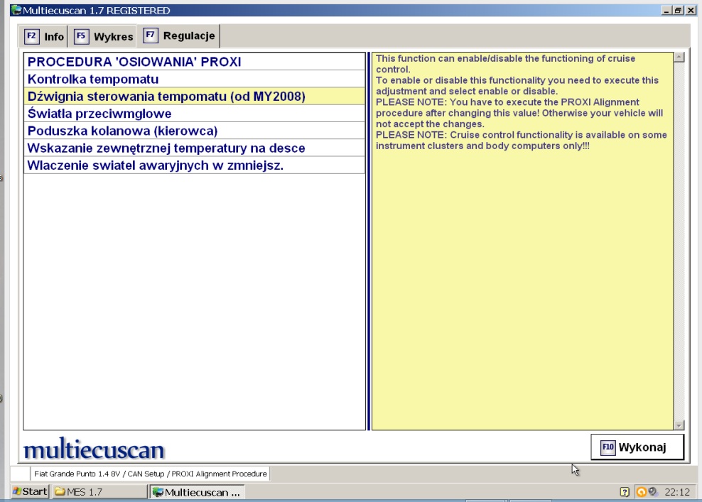 Dopiero użycie programu MultiEcuScan 1.7 pozwoliło na poprawną aktywację CC. Należy wejść w opcję CAN Setup/PROXI Alignment Procedure i tam włączyć dwie opcje: 1. Dźwignia sterowania tempomatu (od MY2008)2. Kontrolka Tempomatunastępnie wykonać OSIOWANIE PROXI i powinno działać. Załącznik: