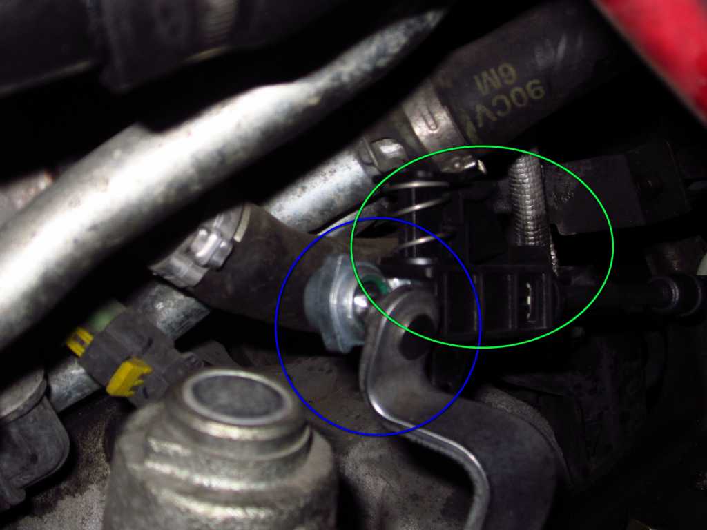 Następnie odpinamy linkę, która przymocowana jest na (chyba to się tak nazywa) zawiasie kulkowym - niebieskie kółko. Tutaj przyda się długi płaski śrubokręt. Załącznik: