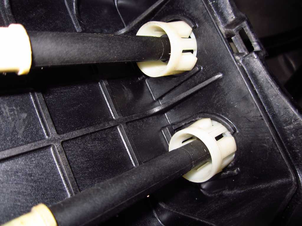 tutaj odpinamy linkę połączoną z mechanizmem lewarka takim samym sposobem jak na drugim końcu w komorze silnika, płaski śrubokręt i po sprawie. Przy wyjściu linki z tego "pudełka" musimy uporać się z zatrzaskiem. Najlepiej z zewnętrznej strony (fot. 2 poniżej) podważać delikatnie jednocześnie od wewnętrznej (fot. 1 poniżej) naciskając na zatrzaski. Plastiki jest dosyć twardy, ale tutaj raczej nie ma go jak połamać, zatrzaski są cztery, odpinamy je po kolei jednocześnie delikatnie wysuwając całość ruchami obrotowymi. Załącznik: