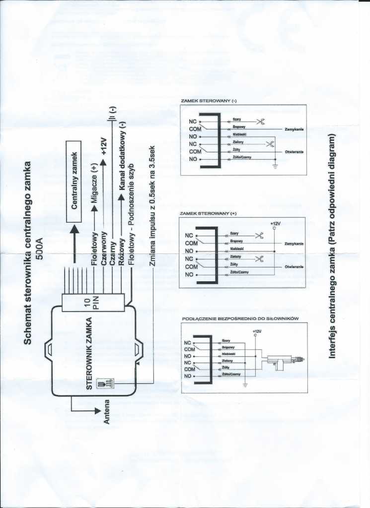 Widziałeś ten poradnik: topic22990.html ? według tego poradnika jest tak: Biały - zamykanie Niebieski - otwieranie Interesuje Cie schemat numer 1. Czyli zamek sterowany -, szary i zielony nie jest Ci do niczego potrzebny, brązowy od sterownika łączysz z białym, żółty sterownika łączysz z niebieskim. Zielono czarny i niebieski od sterownika łączysz z masą. Przynajmniej tak wygląda to na schemacie Możesz też dla pewności zapytać sprzedawcy u którego kupiłeś sterownik czy tak to ma być
