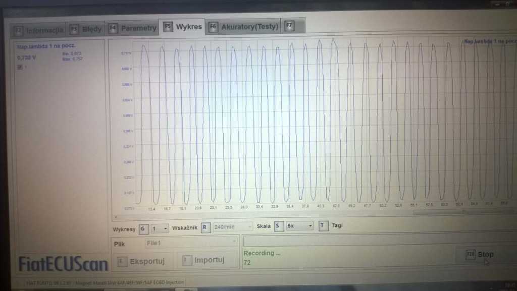 Powiem Wam, że chciałem w PII 1.2 16v sprawdzić napięcia obu sond lambda i jest jedynie opcja pomiaru drugiej sondy. Ta sonda na ciepłym silniku dawała stały odczyt. Odczyt drugiej powinien być sinusoidą na ciepłym silniku? Niestety nie mam możliwości pomiaru pierwszej, gdyż w MultiEcuScanie nie widzę takiej opcji. Jest tylko sonda za katalizatorem. W 8v są możliwe oba pomiary, a w 16 nie widzę