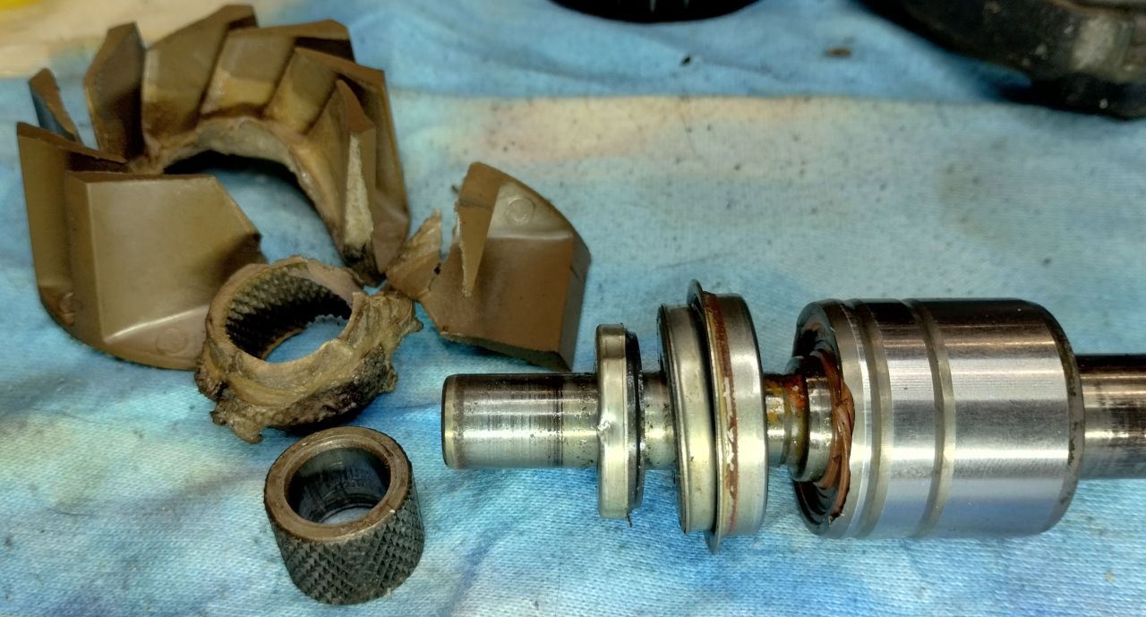 Szybka sekcja pompy wody. Jako-tako da się to rozebrać, niektóre elementy. Wcisk jest duży, ale z różnicą temperatur pójdzie zwykłym ściągaczem. Pompa cała w śniegu, później koło pasowe nagrzane palnikiem (pod napięciem ściągacza). Załącznik: