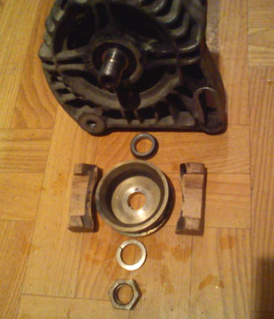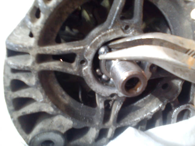 W alternatorach spotykanych w Punto (np. w Uno nie było czegoś takiego), może się zdarzyć, że ośka w miejscu osadzenia większego łożyska (bardziej obciążonego przy kole pasowym) ma mniejszy wymiar niż standardowy i wymaga specjalnego łożyska o bardziej ciasnym pasowaniu na ośkę niż normalne (zwyczajne łożysko można wcisnąć ręką). W sporej części sklepów nie mają o tym pojęcia ("łożysko, to łożysko, o co chodzi?"). Tak też było w tym przypadku, ale sytuacja nie jest beznadziejna, można sobie z tym poradzić - będzie o tym mowa w dalszej części...