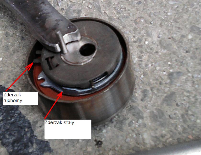 12. Po napięciu napinacza dokręcamy nakrętkę napinacza z momentem ok. 28Nm. Użyłem klucza dynamometrycznego giętego z Castor... za niecałe 50zl. Można też skręcić to ręcznie, ale 50zł. nie majątek, a klucz się przyda. 13. Obracamy wałem korbowym jakieś 4 obroty w prawo tak aby pasek się ułożył i sprawdzamy zderzaki napinacza. W moim przypadku nie trzeba było nic poprawiać. Znaki na napinaczu są z dołu więc bez lusterka się nie obejdzie. Załącznik: