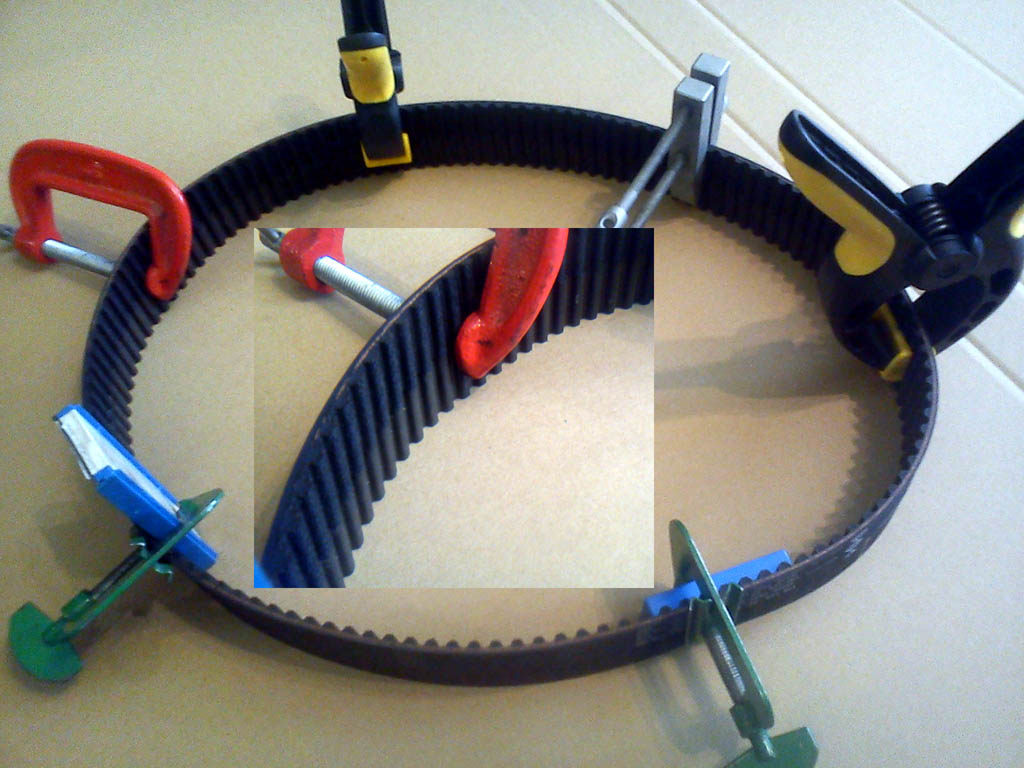 10. Montujemy nowy pasek tak aby znaki na nim pokryły się ze znakami na kołach. Nieco przekręcamy kołem wałka rozrządu aby pasek był napięty po stronie pompy wody. Wygląda to mniej więcej tak. Załącznik: