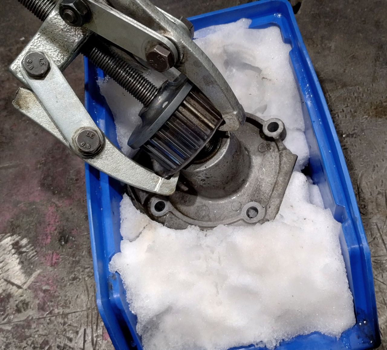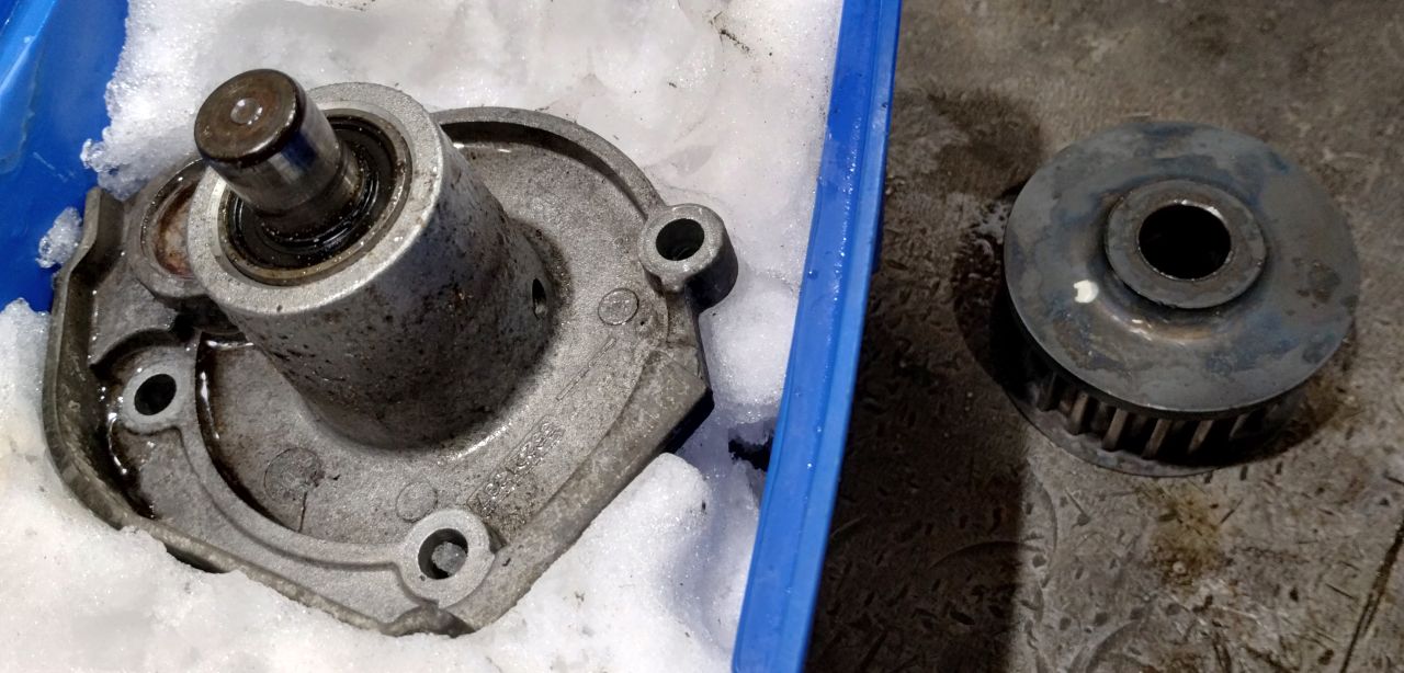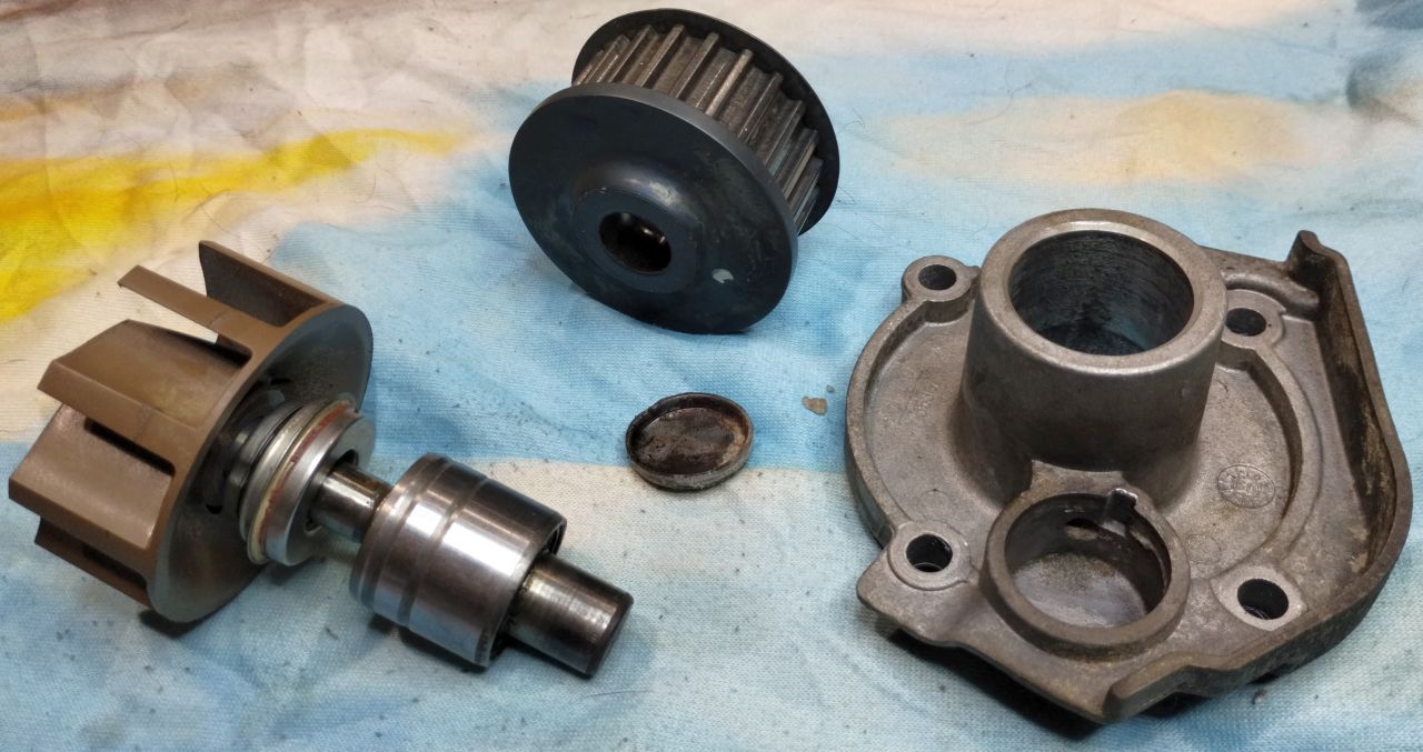 Szybka sekcja pompy wody. Jako-tako da się to rozebrać, niektóre elementy. Wcisk jest duży, ale z różnicą temperatur pójdzie zwykłym ściągaczem. Pompa cała w śniegu, później koło pasowe nagrzane palnikiem (pod napięciem ściągacza). Załącznik: