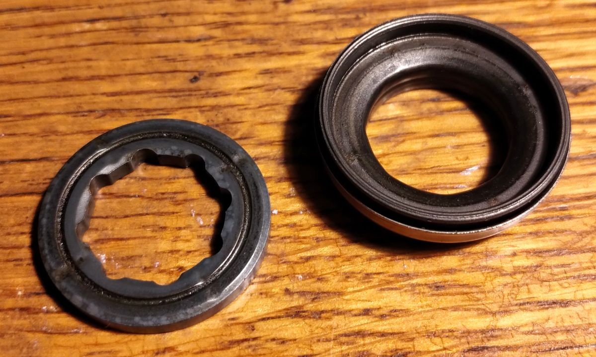 Jest trochę elementów składowych. Nieruchomy pierścień (1 z prawej) siedzi w gumowej przeponie/mieszku (2 element od prawej), inaczej płyn by pomijał pierścienie i szedł na około do łożysk. Tak więc konstrukcja czołowego uszczelnienia nie jest samodzielna (że tylko 2 pierścienie i koniec), inne elementy też są (gumowe najczęściej). Pierścień nieruchomy jest dociskany wstępnie sprężyną falistą, ciśnienie też pomaga (ale jednocześnie unosi gumowy mieszek, czyli np. tam może pompa popuścić, nie tylko na czole pierścieni). Załącznik: