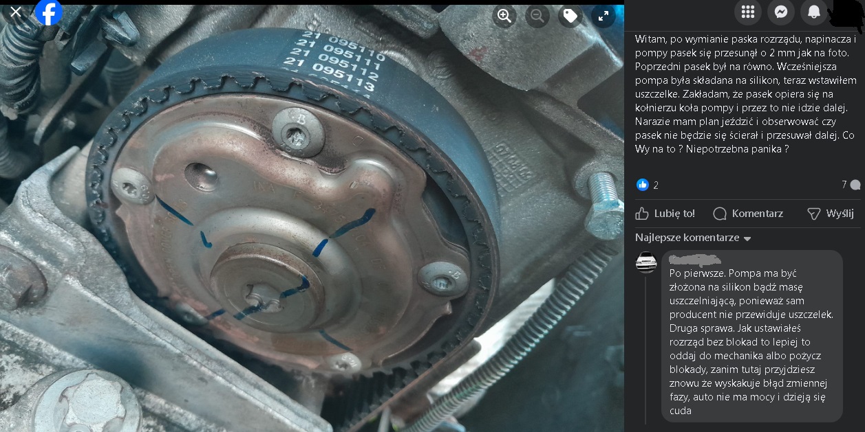 Całkiem po krawędzi pasek nie powinien jeździć (ani w lewo ani w prawo), prędzej się pompa rozpadnie, zacznie lać strumieniem. U mnie tam jest 1-1,5 mm odstępu od krawędzi koła, tylko na fotografii nie widoczne. Sprawdzajcie to u siebie (Przed i Po zrobieniu rozrządu). PS Na kole wału korbowego może być odwrotna sytuacja, pasek jest wciągany w stronę silnika. Na starym rozrządzie (pompie) u mnie tak było (a jak jest teraz, nie sprawdzę tego na razie). -------------------[ Dodano: 04 Paź 2020, 20:20 ]------------------Podejrzenie się potwierdziło. Luzy pompy powodują uciekanie paska z rolek/kół. Przykładowa stronka z takimi ciekawostkami: https://www.repxpert.pl/pl/media-library#!/medialib/?language=PolskiZakładka "informacje serwisowe": https://www.repxpert.pl/pl/media-library#!/media-library//Informacje%20serwisowePrzykładowa informacja/ostrzeżenie serwisowe: https://www.repxpert.pl/pl/mediadocument/INA-0182-PL/plPowinno się otworzyć jako PDF. Jeśli nie, to cytat. Cytuj: W trakcie eksploatacji pojazdu często dochodzi do zwiększenia luzu łożyska pompy wody. W wyniku tego boki paska rozrządu będą napierały dużą siłą na zewnętrzne części kół, co w rezultacie spowoduje zniszczenie paska. Oderwane fragmenty mogą uszkadzać inne komponenty napędu rozrządu. Aby uniknąć dodatkowych kosztów, pompę płynu chłodzącego należy wymieniać zawsze razem z komponentami układu napędu rozrządu.
