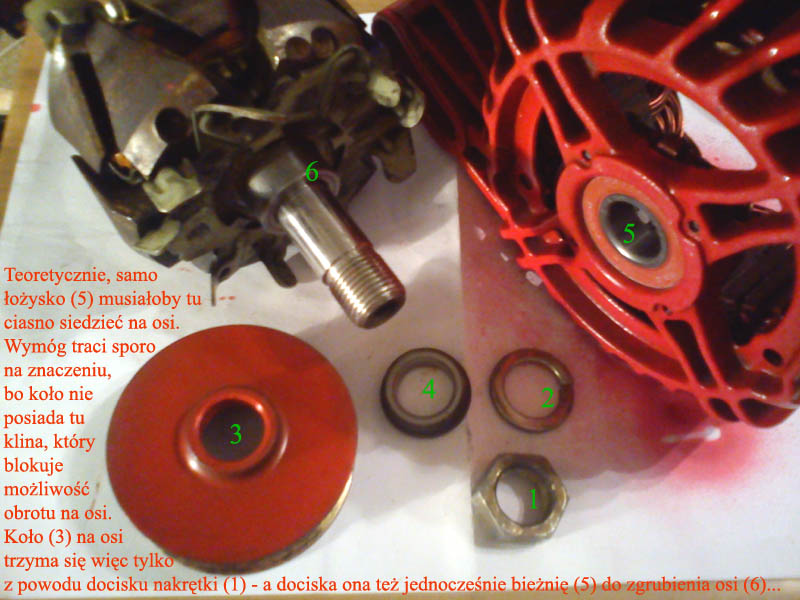 ImageW alternatorze łożysko od strony koła pasowego, teoretycznie powinno mieć ciasno pasowaną wewnętrzną bieżnię na ośce. To prawda, ale sytuację zmienia fakt, że bieżnia razem z kołem pasowym jest trzymana przez docisk nakrętki (koło pasowe nie ma żadnego klina ustalającego). Wymóg ciasnego pasowania dotyczy czystej sytuacji, gdzie łożysko nie jest niczym trzymane na pozycji (a tym bardziej dociskane na chama przez nakrętkę).