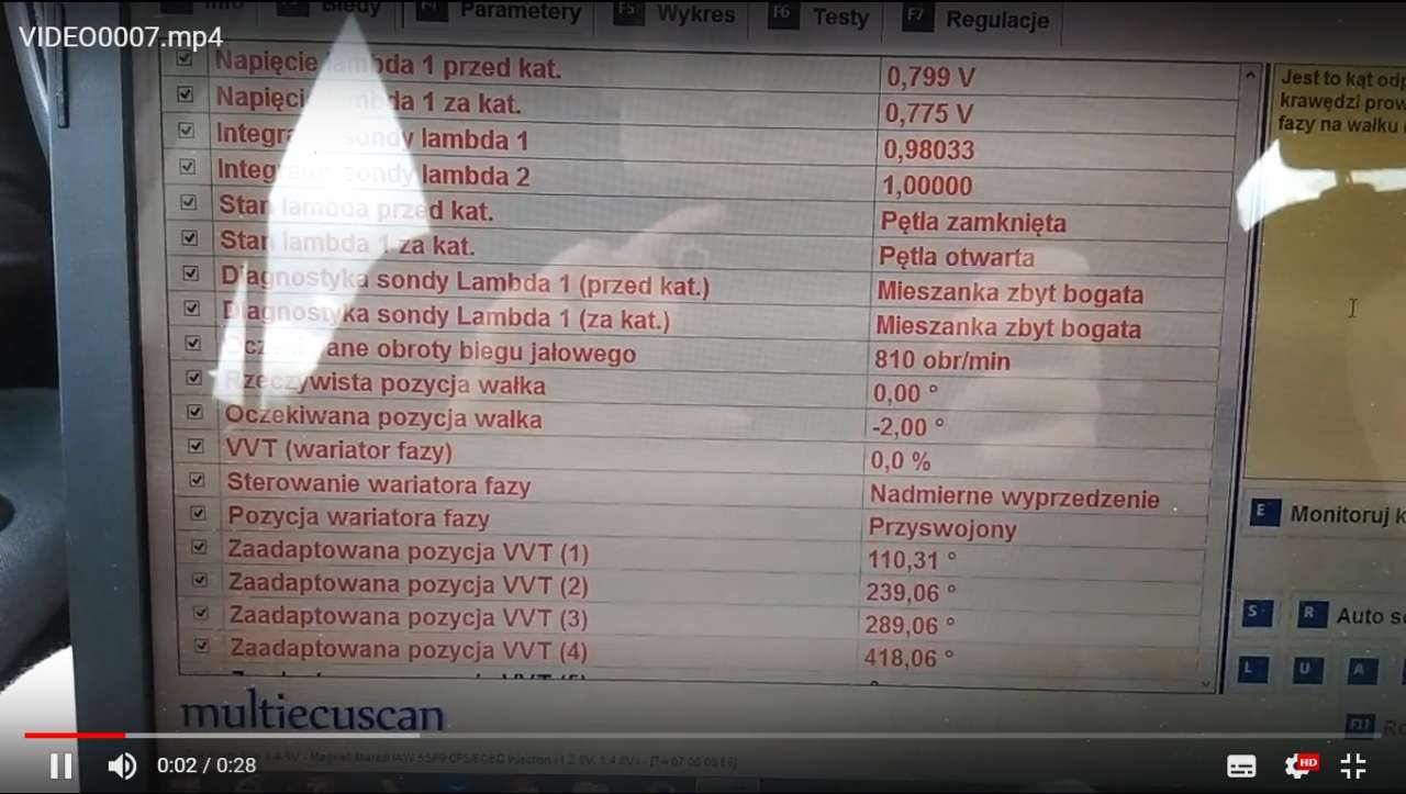 Witajcie, kieruje się do Was z prośbą o pomoc w rozwiązaniu mojego problemu, od pewnego czasu borykam się z problemem - bez względu czy silnik cieply czy zimny na biegu jałowym 10s pracuje normalnie i nagle poszarpuje, wibracje czuć na całej karoserii, dodatkowo zdecydowanie więcej pali i brakuje mocy. Co do tej pory zrobiłem to wymieniłem swiece i przewody WN. Dzisiaj skontrolowałem swiece zaledwie po 3 dniach ? na swiecach jest juz osad swiadczacy o zbyt bogatej mieszance. Gdzie szukać problemu ? Intryguje mnie jeszcze z FESa korekta powietrza biegu jałowego - skacze czasami na 6550% i kolejna rzecz to sterowanie wariatorem fazy, chyba też coś nie tak ? Oraz czujnik spalania stukowego czemu nie pokazuje żadnej wartości ? uszkodzony ? Poniżej wklejam linki do filmików z FESa z parametrami pracy silnika https://drive.google.com/open?id=0B-JNe ... 20tbDJPejghttps://drive.google.com/open?id=0B-JNe ... lpJSXlmajAhttps://drive.google.com/open?id=0B-JNe ... U8xcUlKT2M