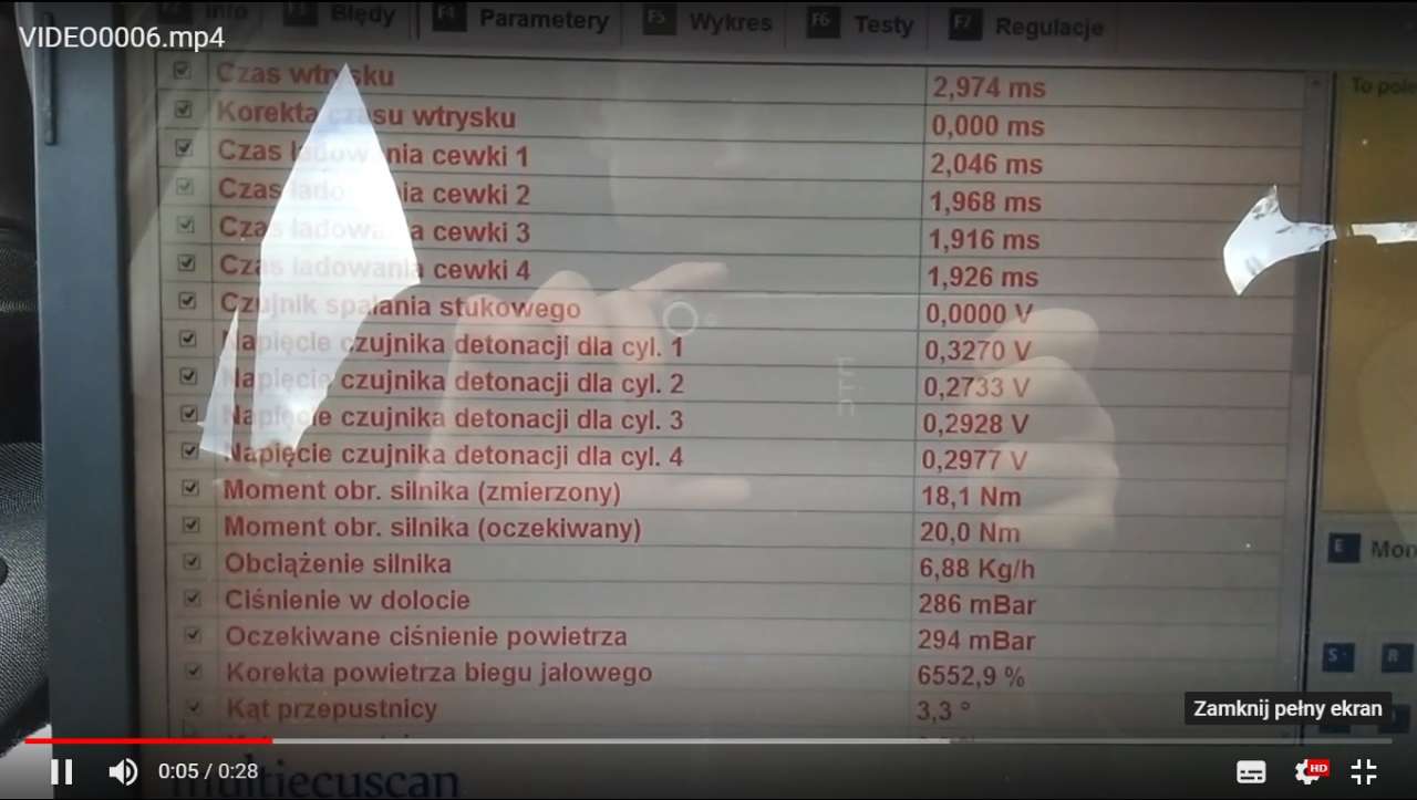 Witajcie, kieruje się do Was z prośbą o pomoc w rozwiązaniu mojego problemu, od pewnego czasu borykam się z problemem - bez względu czy silnik cieply czy zimny na biegu jałowym 10s pracuje normalnie i nagle poszarpuje, wibracje czuć na całej karoserii, dodatkowo zdecydowanie więcej pali i brakuje mocy. Co do tej pory zrobiłem to wymieniłem swiece i przewody WN. Dzisiaj skontrolowałem swiece zaledwie po 3 dniach ? na swiecach jest juz osad swiadczacy o zbyt bogatej mieszance. Gdzie szukać problemu ? Intryguje mnie jeszcze z FESa korekta powietrza biegu jałowego - skacze czasami na 6550% i kolejna rzecz to sterowanie wariatorem fazy, chyba też coś nie tak ? Oraz czujnik spalania stukowego czemu nie pokazuje żadnej wartości ? uszkodzony ? Poniżej wklejam linki do filmików z FESa z parametrami pracy silnika https://drive.google.com/open?id=0B-JNe ... 20tbDJPejghttps://drive.google.com/open?id=0B-JNe ... lpJSXlmajAhttps://drive.google.com/open?id=0B-JNe ... U8xcUlKT2M