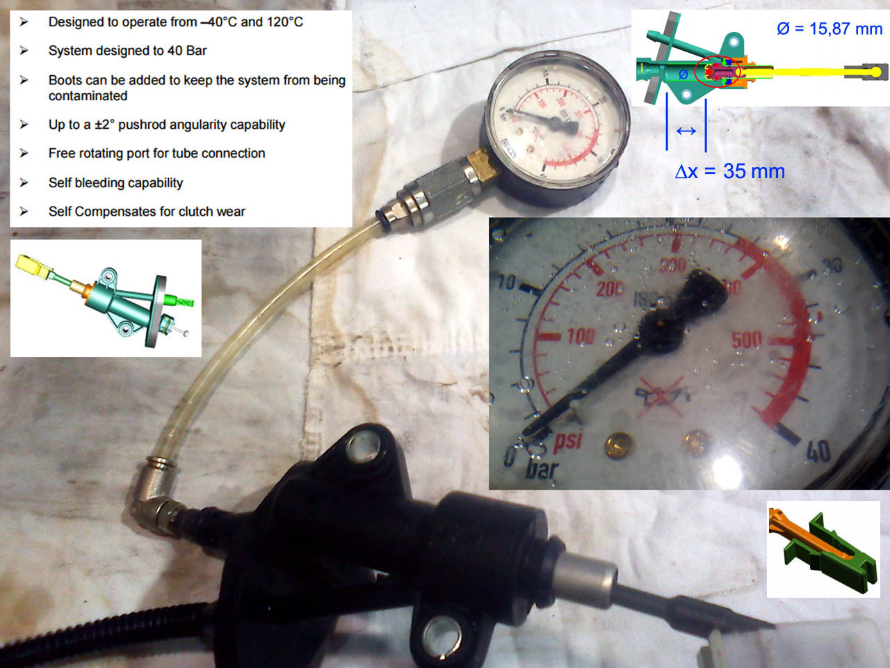 Przy skoku roboczym całkowitym pompki 35 mm, przesunięcie wysprzęglika wynosi 20 mm (bo średnice tłoczków są inne), chociaż te "20 mm" może się zaczynać i kończyć w innym miejscu (zależnie od zużycia sprzęgła i położenia łapy), po to jest zapas długości siłownika (to jest powód, że "hydraulicznego sprzęgła się nie reguluje"). Testy były przy użyciu wody. Sprężyna wewnętrzna siłownika usunięta (bo by się sam wysuwał).