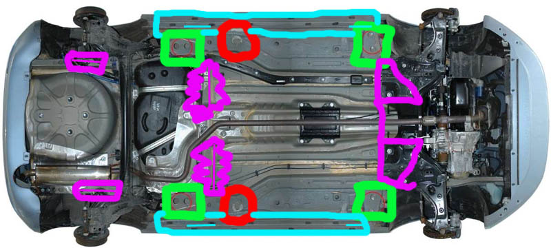 Na pewno nie należy podkładać niczego pod duże płaskie powierzchnie (typu podłoga) poziome, co na obrazku widać (tył pojazdu, zaznaczone grubo na czerwono), zdarta konserwacja bo ktoś podstawił warsztatowy podnośnik, gołymi metalowymi "łapami" prosto w blachę ("fachowcy" w wielu warsztatach tak robią - auto naprawione, ale pokaleczone).