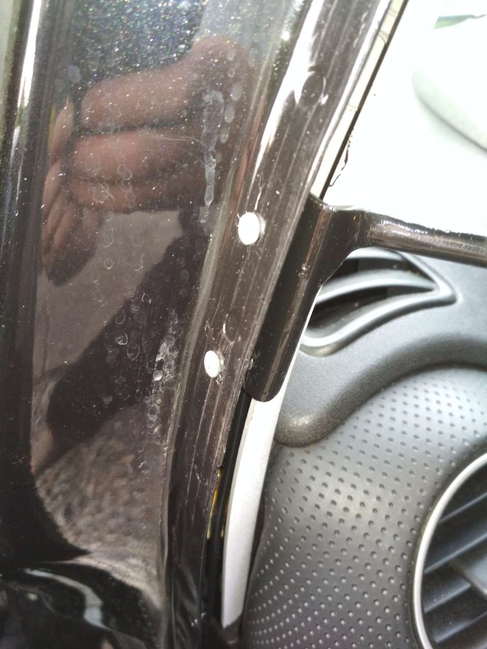 Zrobiłem metalowy wspornik mocowany do lewego słupka pod uszczelką drzwi. Wspornik zakończony jest kulką pasującą do uchwytu hipermarketowego na przyssawkę. Nic nie drży, nie telepie się, nie zasłania szyby (no trochę lewy trójkącik). Telefon jest bezpośrednio przy drzwiach więc mogę zamocować go do uchwytu zanim wsiądę do auta. Przy wysiadaniu tak samo. Wysiadam i wyjmuję telefon z uchwytu. Trochę trzeba się narobić, ale jest ok.